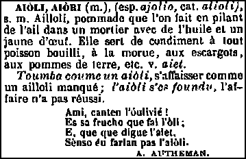 L’aiòli est une émulsion montée avec de l’ail, de l’huile (òli) d’olive et du jaune d’œuf.