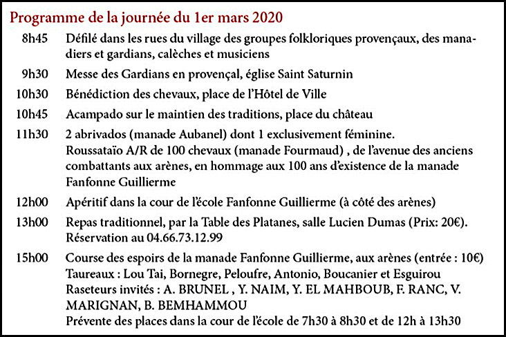 Le Service des Festivités de la commune d’Aimargues a eu l’amabilité de me faire parvenir le programme détaillé de la journée du 1er Mars.