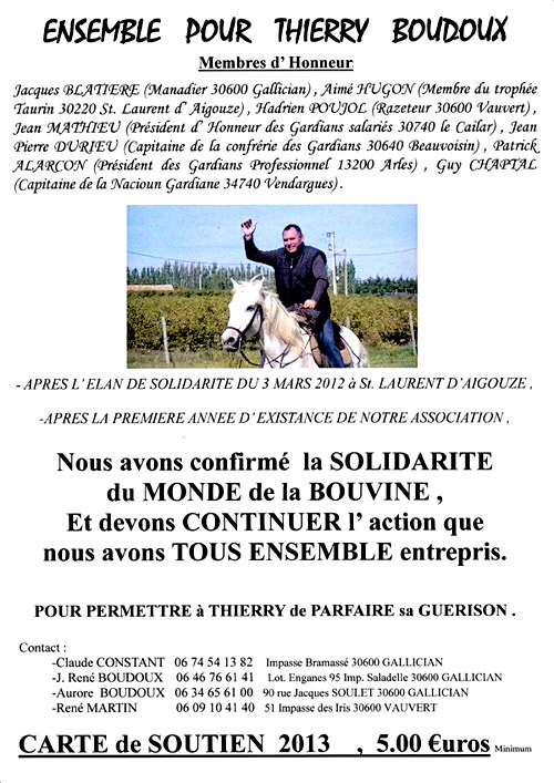 C’est Monsieur Gérard Gayaud, maire de Vauvert, qui avec son sens de la formule a resumé le sens de la réunion : "Je n’ai jamais autant souhaité qu’une association disparaisse ; sa disparition marquera la guérison de Thierry Boudoux !"