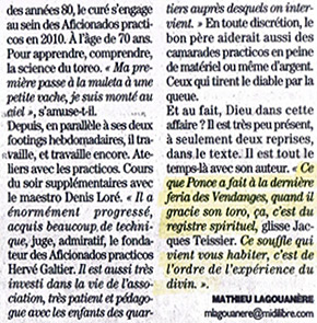 "lisez ce magnifique reportage du Midi Libre de ce jour (30 sept. 2018) sur la corrida vue par J.Teissier, aumônier des arènes de Nîmes intitulé "La corrida effraction salutaire".