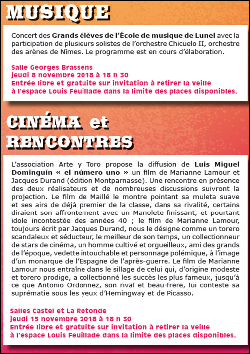 C’est un large rendez-vous culturel autour de la culture tauromachique que la Ville de Lunel, en partenariat avec les associations Arte y Toro (Nîmes) et Les Avocats du Diable (Vauvert), propose au public lors des « Rendez-vous des Aficionados a las toros ».