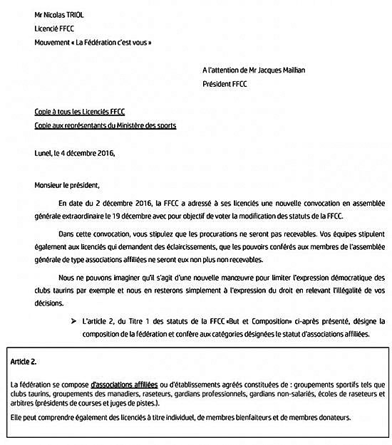 En transmettant copie de son courrier aux "représentants du Ministère des Sports" le ton monte, il démontre qu’il n’est pas là pour la parlotte mais que la FFCC actuelle va devoir justifier, devant les instances légales, de la conformité de ses choix.
