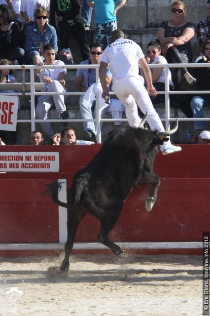 Chez les Noirs, Ulmet a su faire la différence. Impressionnant, il débute son quart d’heure malmené par des séries déroutantes, dont il se défait, avant de dominer son sujet, retenant son deuxième gland jusqu’à la 13e minute. Vif il termine volontiers ses actions aux planches, et offre ainsi le meilleur quart d’heure d’une après midi qui aura montré un lot de taureaux en fort bonne forme, depuis un Quito qui tient 11 minutes alors qu’il se livre pourtant volontiers en passant par un Bandoulier de Blanc qui ne cède ses attributs que sur des séries fournies sur lesquelles il ne refuse rien, jusqu’à un Tiennou (HP) qui termine une excellente course lui offrant au passage un carmen général. Pierrounnet offre également une excellente prestation ponctuée même par de belles envolées notamment sur Sabatier.
