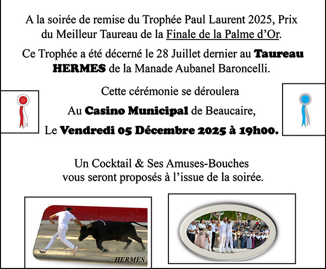 Le Club Taurin Beaucairois a l’honneur de vous convier à la soirée de remise du trophée Paul Laurent 2025, prix du Meilleur Taureau de la Finale de la Palme d’Or.