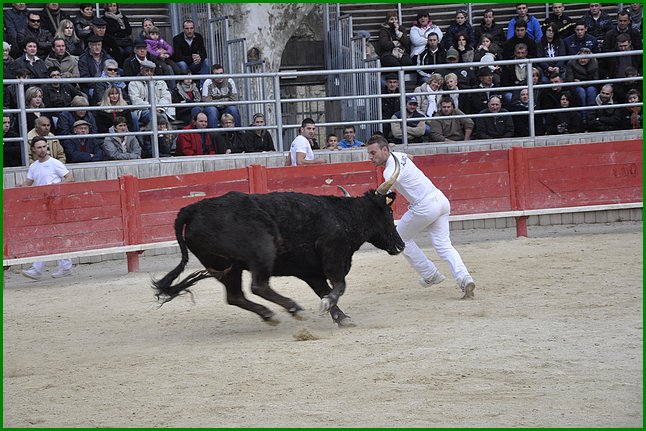 Samedi dans les arènes au pied l’église, avec des gradins bourrés jusqu’au faîte de gens passionnés, a eu lieu cette course de la bonne cause organisée par l’association des gardians salariés, le comité des fêtes et le club taurin "Lou Bandot" de St Laurent. Tous ont donné de leur temps même le Patriarche Aimé Hugon reconverti en coupeur de billets.